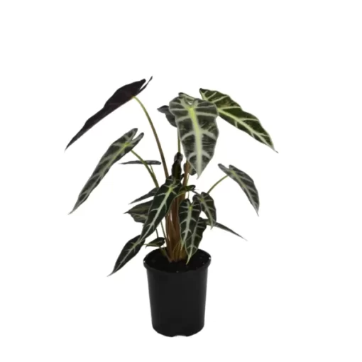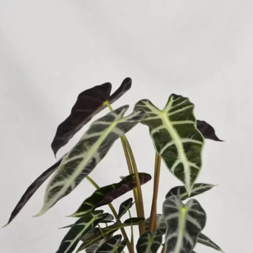 Exhibiting dreamy arrowhead leaves, the Alocasia Bambino comes in a compact, ornamental size making for a stylish feature to your home. Perfect for those looking for something to fit a smaller space this variety of Alocasia has stunning amethyst-coloured undersides on its leaves to accompany the long, velvety, emerald-black leaves with lustrous silver-lime patterning. It is easy to care for and grow, given the proper tropical environment.