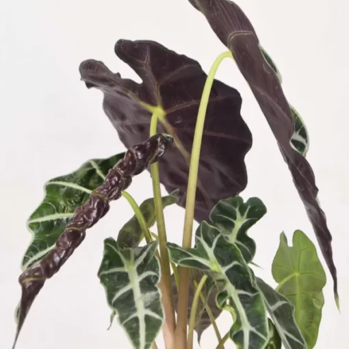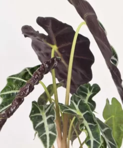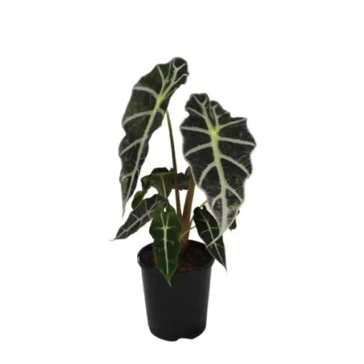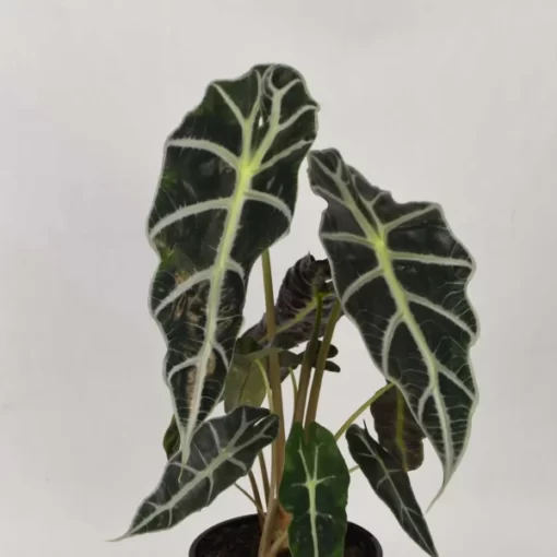 This almost gothic looking Alocasia has a jagged edge around each leaf and a dark, almost black colour, giving it a stunningly severe appearance. The bold silvery-green veins that streak across the leaves add character. This plant is one you will want to show off and with proper care will thrive, producing long mysterious styled leaves that will leave you breathless.