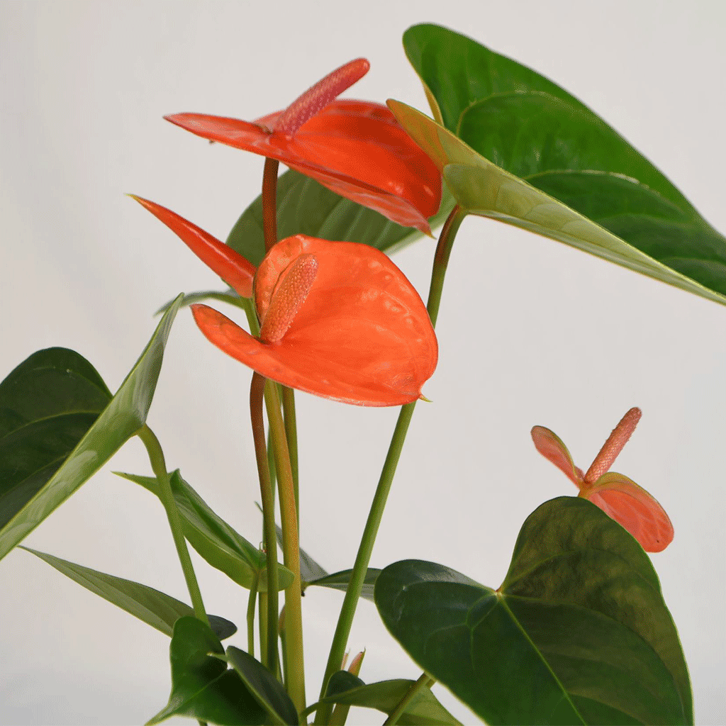 This short variety of Anthurium, Bugatti Royale flowers with tangerine spathes that have a sunset-coloured spadix. This plant is a vibrant feature to your home or tropical garden with its bright pear-shaped leaves that grow in abundance. While this plant adds regal vibes to your space it also purifies your air as though you are royalty too.