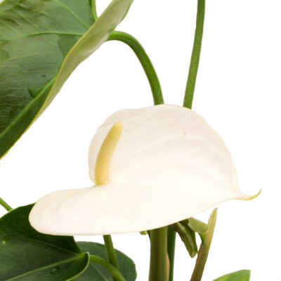 Anthurium White Winner is a tropical plant featuring brilliant white flowers with green, yellow/white spadix.