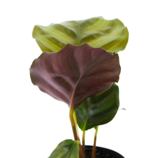 The velvety feeling leaves on this plant have a triangular contrasting pattern to the top of the leaves, and a deep maroon colour to the underside that branch out from dark stems in a clumping formation.