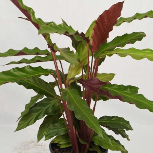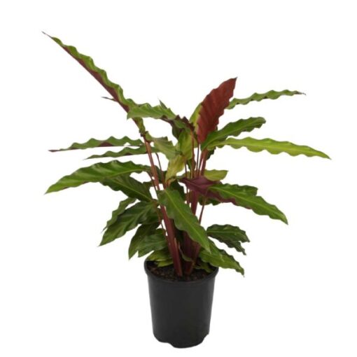 This Calathea stands out compared to others with its velvet undersides and stems in a stunning rhubarb shade. The green leaves with their pretty tousled nature are glossy in contrast with the furry undersides. This is a tall variety of Calathea that will fill your space and elevate it by adding variety just as a jungle oasis has. You’ll want this unique and slender beauty around for its air-purifying qualities too.
