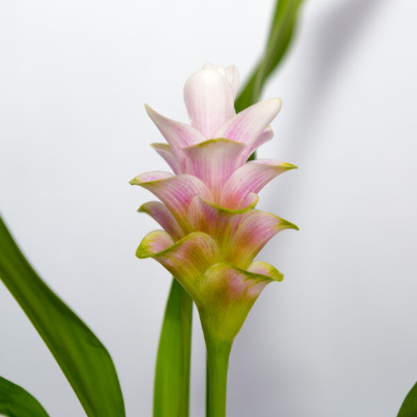 Mosaics of flowers bloom in the town of Anna Paulowna in the Netherlands and this Curcuma fits that description perfectly. With an array of colours that all seep into one another, a gradient of pastel-green to strawberries and cream at the top. Those gentle green hues blend with the leaves and stems while soft pink bracts appear symmetrical in the shape of waves.