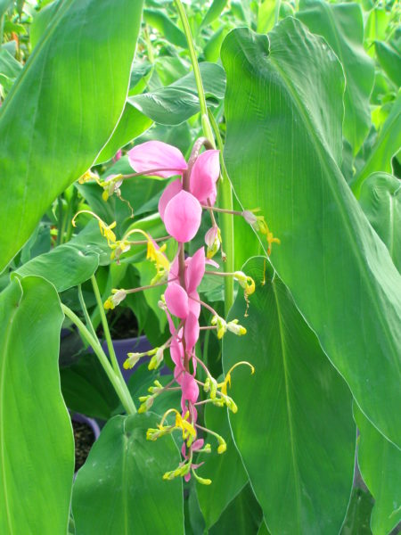 Bright pink coloured, lance-like petals arranged around a single central stem in pairs that launch tiny, yellow flowers.