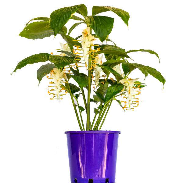 White lance-like petals arranged around a single central stem in pairs that launch tiny, yellow flowers. Green foliage.