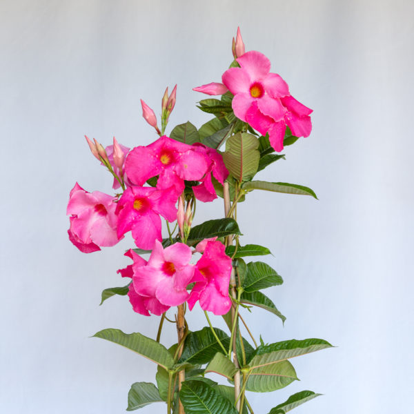 A delicate vine with symmetrical foliage will wrap around the nearest climbing structure and produce an abundance of soft pink, wide flowers with a deep center.