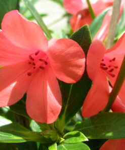 A tall shrubbing plant that produces large round bursts of red and yellow trumpet shaped flowers.