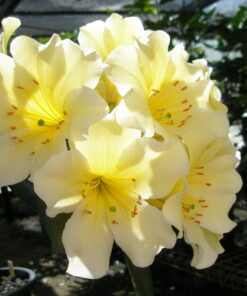 A tall shrubbing plant that produces large round bursts of deep pink with yellow trumpet shaped flowers.